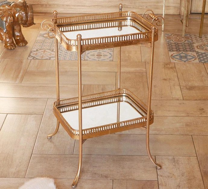 Сервировочный золотой столик на колесах из металла с черной стеклянной